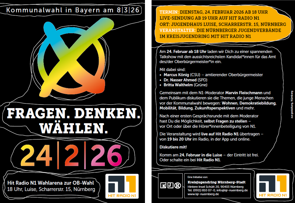 Am 24. Februar, ab 18.00 Uhr, laden die Nürnberger Jugendverbände zu einer spannenden Talkshow mit den aussichtsreichsten Kandidat*innen für das Amt des / der Oberbürgermeister*in ein.