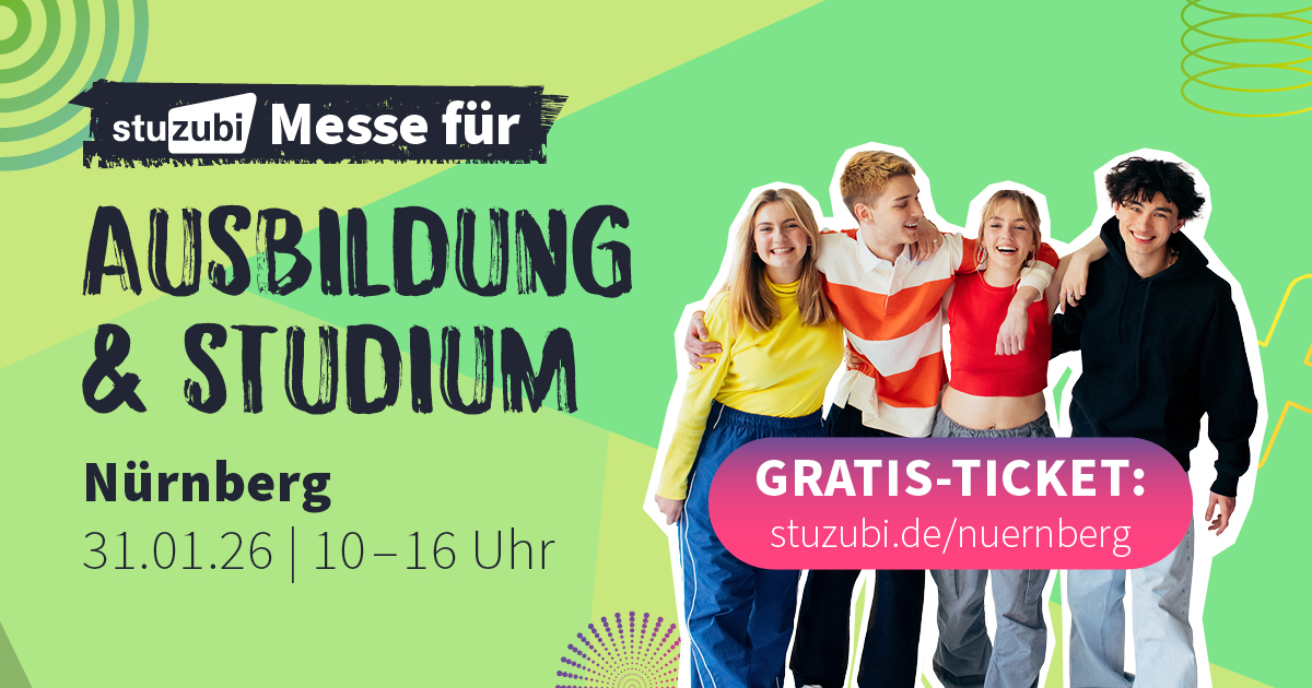 Der Eintritt ist frei, gratis-Tickets sind ab sofort unter https://stuzubi.de/messen/nuernberg?&utm_source=koop&utm_medium=ku-kit&utm_campaign=nu-26